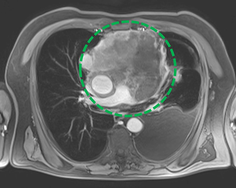 Deutlich später als CT und Röntgen hat sich die MRT in der Lungendiagnostik etabliert. Sie ist aufwändiger als andere Verfahren, bietet aber viele Vorteile – allen voran die Möglichkeit, Aufnahmen der Lunge ohne Röntgenstrahlung zu erhalten. Bei der MRT liegt der Patient in einem starken Magnetfeld, in dem die Wasserstoffatome des Körpers mit einem feinen Radiowellen-Impuls so angeregt werden, dass sie ein schwaches Signal senden. Dieses wird von den Antennen des Gerätes aufgenommen und für die Berechnung der Aufnahmen verwendet. Hierbei erscheinen wasserhaltige Anteile des Körpers (Leber, Muskeln) hell und wasserarme Anteile (auch die Lunge) dunkler. Krankhafte (pathologische) Veränderungen der Lunge mit einer Neubildung von Gewebe (Tumor) oder mit Einlagerung von Flüssigkeiten (bei einer Lungenentzündung oder bei Herzinsuffizienz) kommen hell vor dem dunklen Hintergrund des Lungengewebes zur Darstellung. Die MRT ist zudem hervorragend geeignet, die Weichteile der Thoraxwand sowie des Mediastinums zu beurteilen. In allen Fällen, in denen eine Strahlenexposition vermieden werden soll oder muss – z.B. zur Untersuchung von Kindern oder Schwangeren – bietet die MRT eine wertvolle Alternative. Die Radiologie Darmstadt bietet als erstes privates Röntgeninstitut die MRT der Lunge als Routineverfahren an. Hierzu stehen an mehreren Standorten hochmoderne MR-Tomographen bereit.