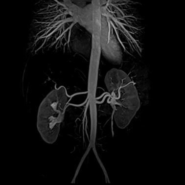 Dieses moderne bildgebende Verfahren ermöglicht umfassende und diagnostisch wichtige Aussagen über die arteriellen Gefäße. Untersucht werden vor allem die Becken-Bein-Gefäße, die Bauchgefäße und die Gefäße im Hals- und Kopfbereich. Nach Injektion eines nicht-jodhaltigen Kontrastmittels kann dessen Weg durch die jetzt stark kontrastierten Adern verfolgt und zwei- und dreidimensional dargestellt werden. Dank moderner MRT-Spulentechniken können auch lange Gefäße mit einer einzigen Aufnahme erfasst werden.